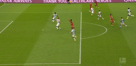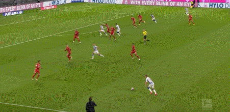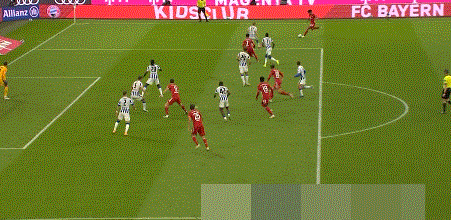 拜仁第85分钟再度超出!阿拉巴任意球吊入禁区,穆勒扛住后卫凌空垫到左侧,莱万左脚凌空推过门线,3比2。