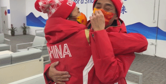 苏翊鸣坡面障碍技巧赛夺银后,师徒二人拥抱庆祝