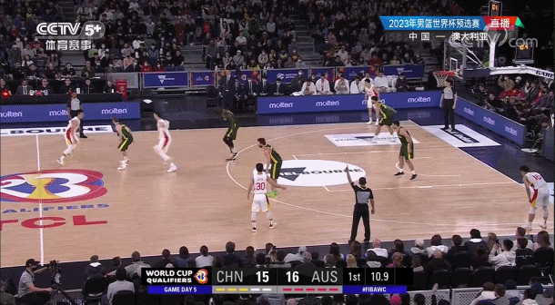 首节比赛最后一攻,王哲林与赵睿打挡拆,王哲林下顺之后接球上篮,在面对澳大利亚多人防守的情况下,打成2+1。