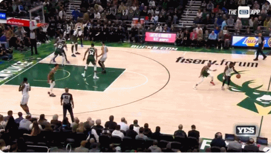 篮网队进攻,杜兰特与西蒙斯进行无球掩护,杜兰特往另一侧移动时,字母哥侧身与杜兰特相撞,随后杜兰特痛苦的捂着被字母哥撞过的肩膀。